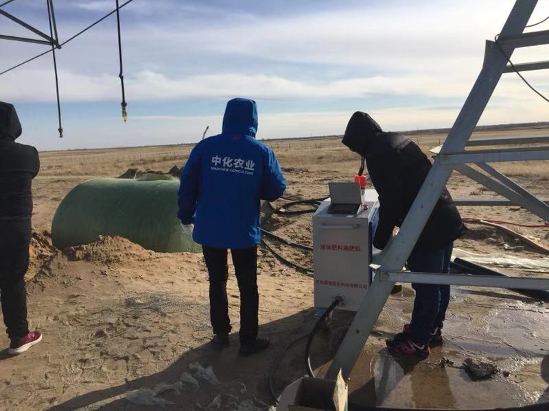 上圖為源潤公司人員與中化現(xiàn)代農(nóng)業(yè)人員,在現(xiàn)場安裝并調(diào)試液體肥料施肥機(jī)。